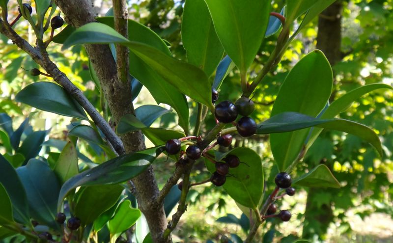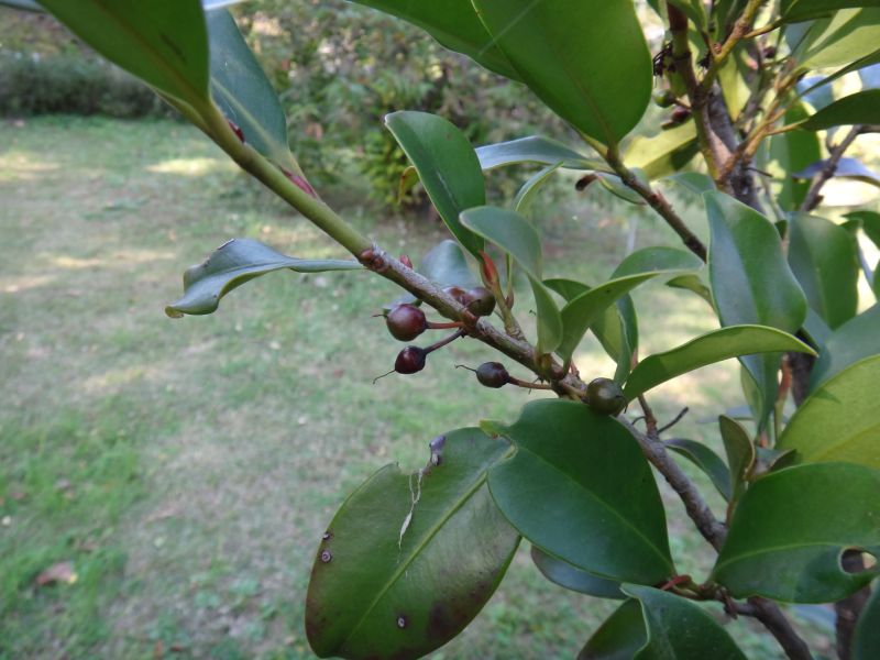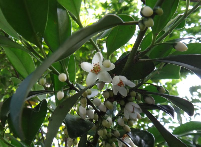 サカキ :葉に鋸歯がない、花は夏咲き5弁に開き、実は7〜8ミリ、果柄が果径の2〜3倍。