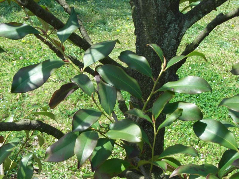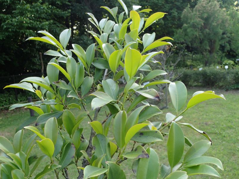 葉は互生し、長さ7〜10センチの長楕円状広披針形で、全縁で厚い。