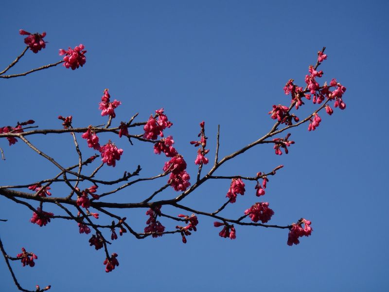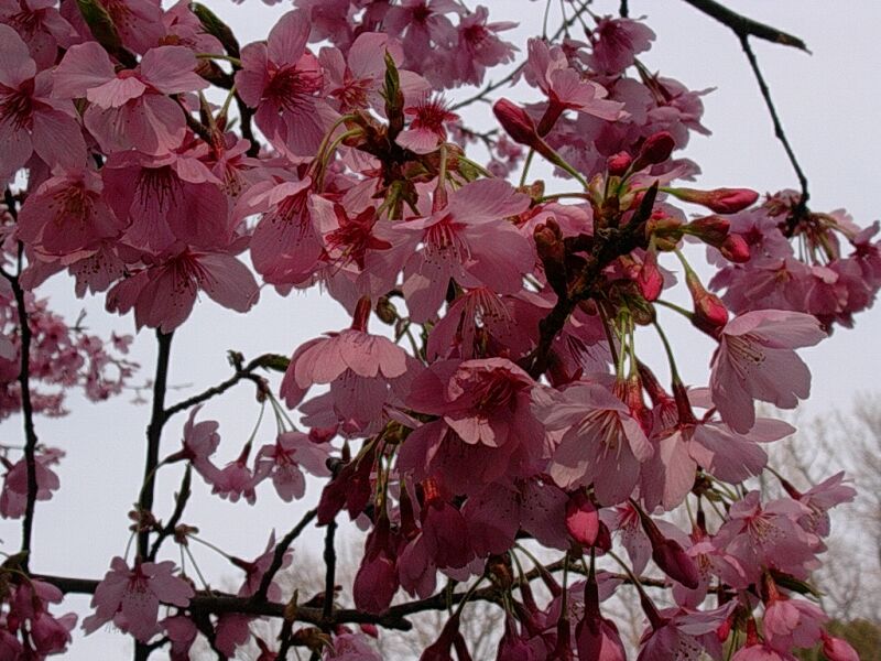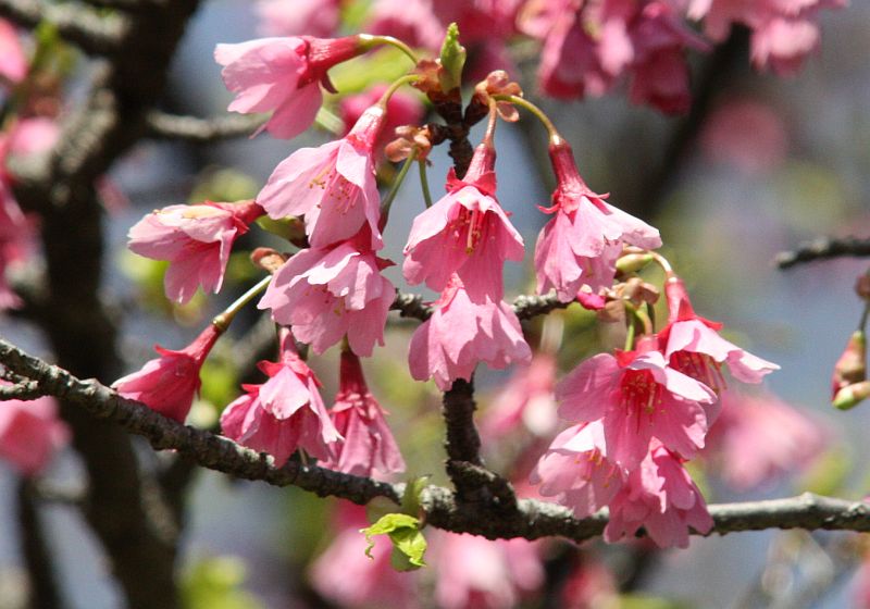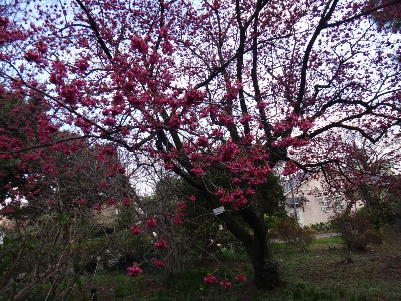 カンザクラ :早春に咲く、高木、一重咲き、花はやや濃い淡紅色、不稔。