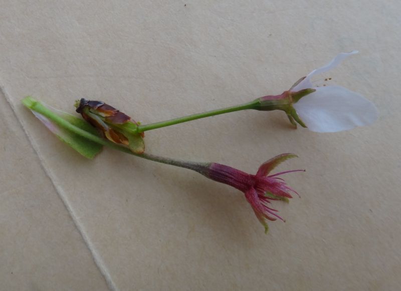 葉の展開と同時に葉腋に白色〜淡紅色の5弁花を数輪咲かせる。