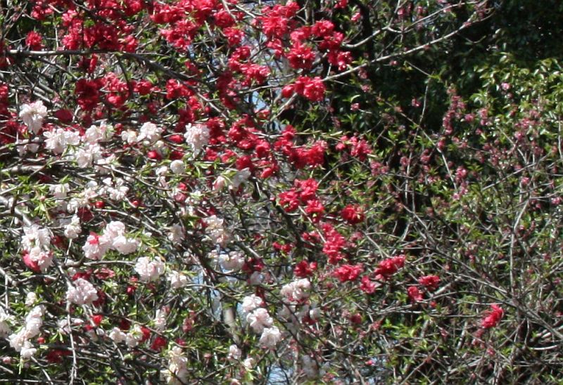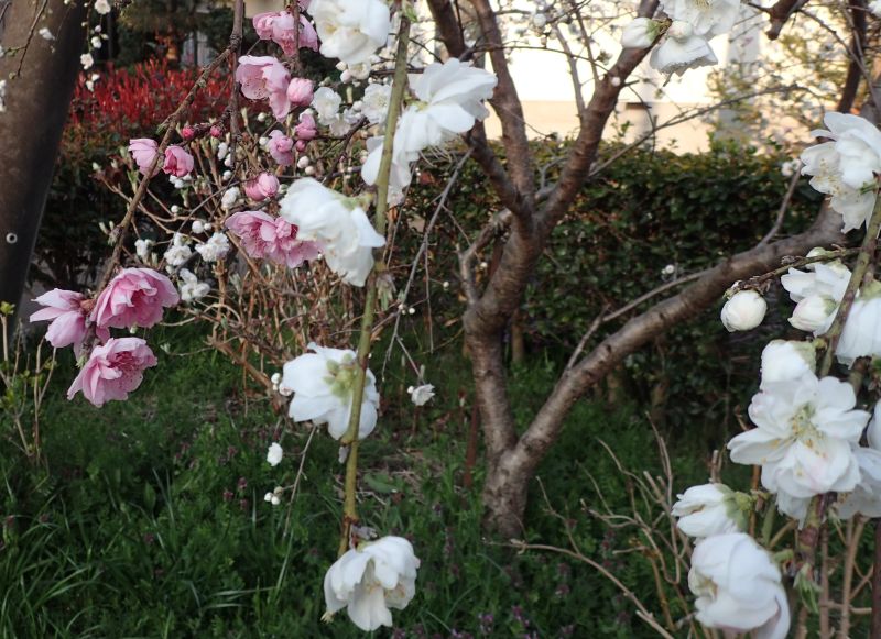 八重紅枝垂れ。同じ木に赤い花と淡紅色の花がついている。