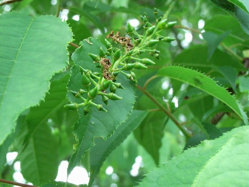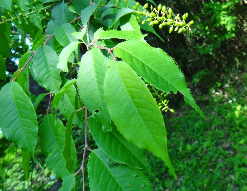 葉は互生し、長さ3〜6センチの卵形で鋭い鋸歯があり、先が尾状にとがる。