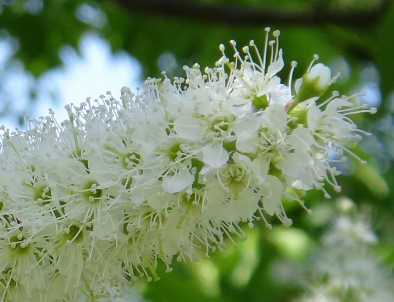 葉の展開後に、新枝の先の総状花序に白い小さい5弁花が密集してつく。