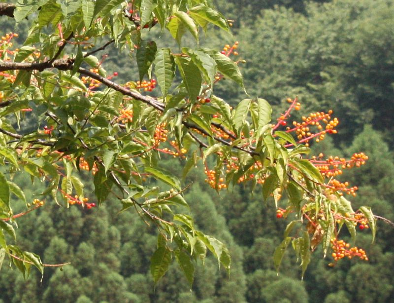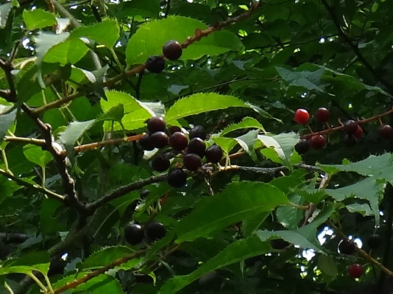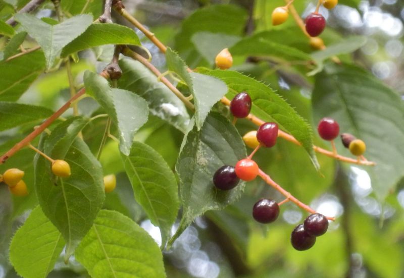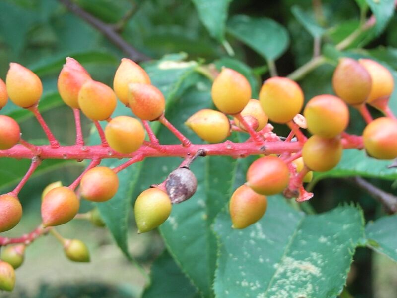 熟すにつれて緑、黄色、赤、黒と変色する。