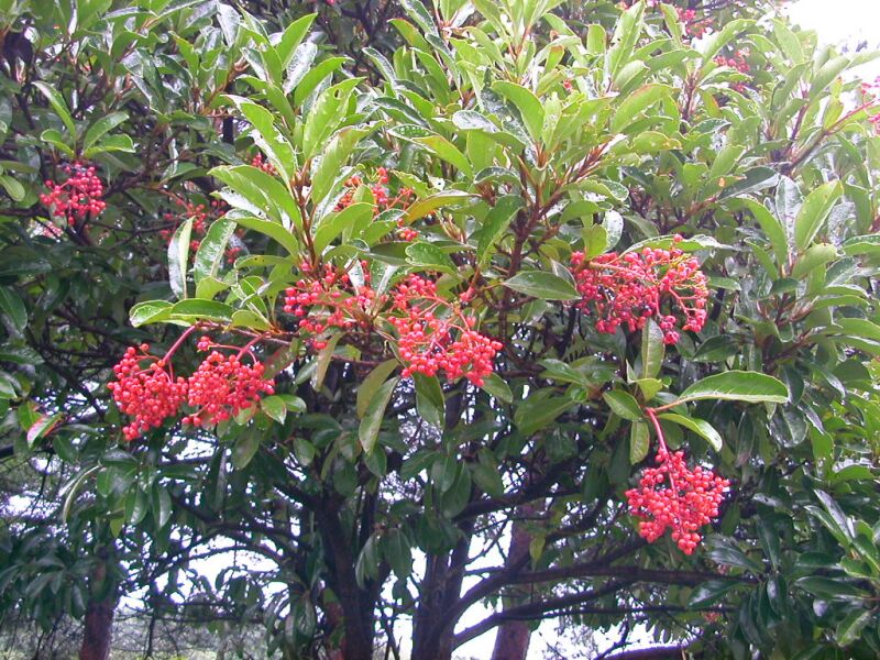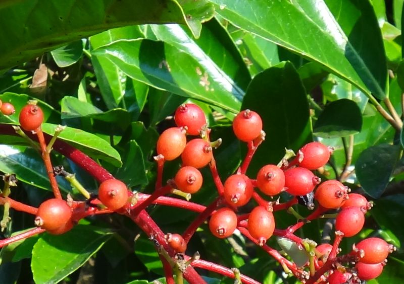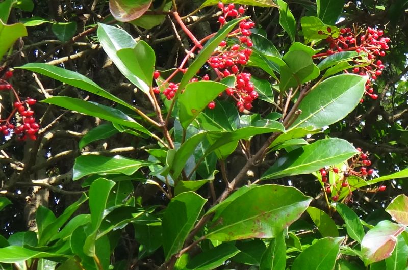 直径7〜9ミリの楕円形で赤い核果を総状にたくさんつける。