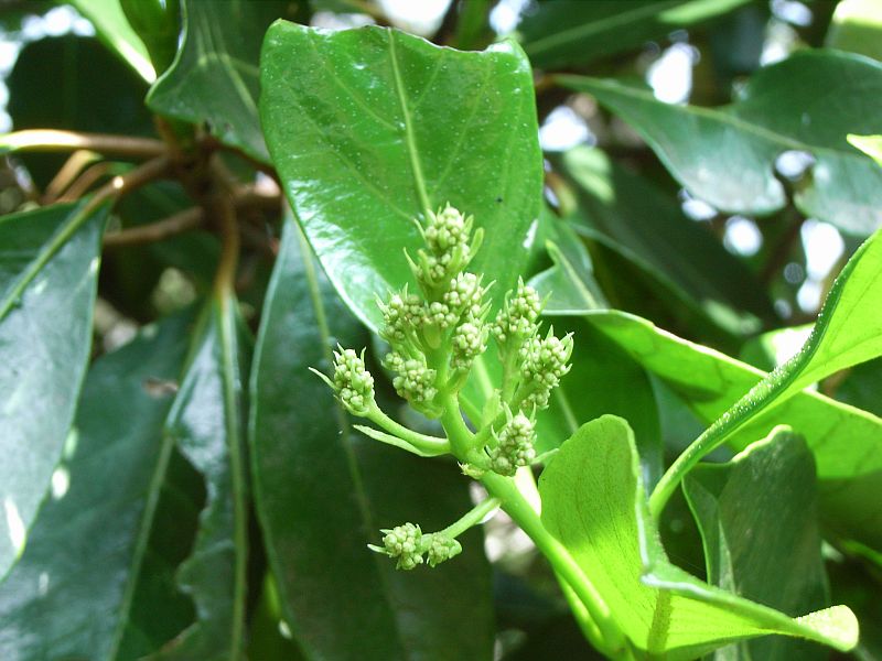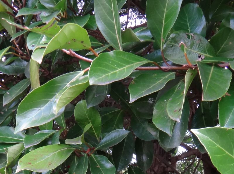 葉は対生し、葉身は長さ10〜20センチの楕円形で、革質で滑らかであり、