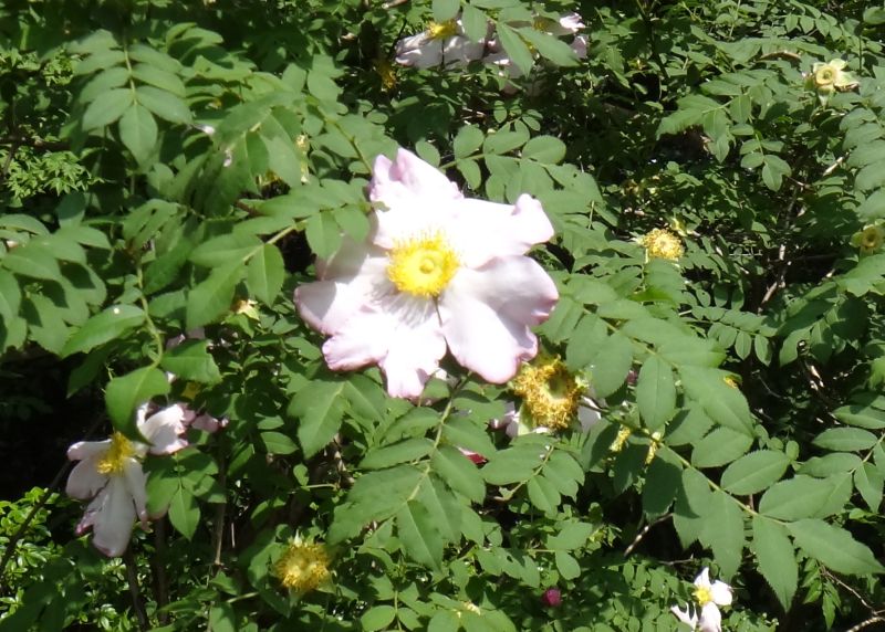 蕾は濃赤色で、初夏に小枝の先に淡紅色の5弁花を1輪つける。