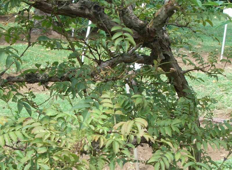 樹皮は灰褐色で古くなるとはがれ、枝に棘があり、よく分枝する。