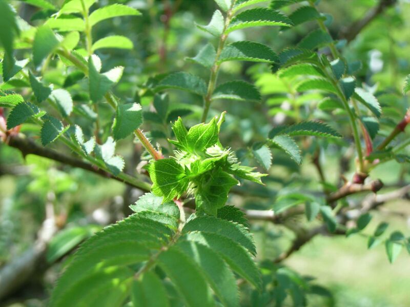 果実は直径2センチぐらいの丸い偽果で、棘が密生しており、