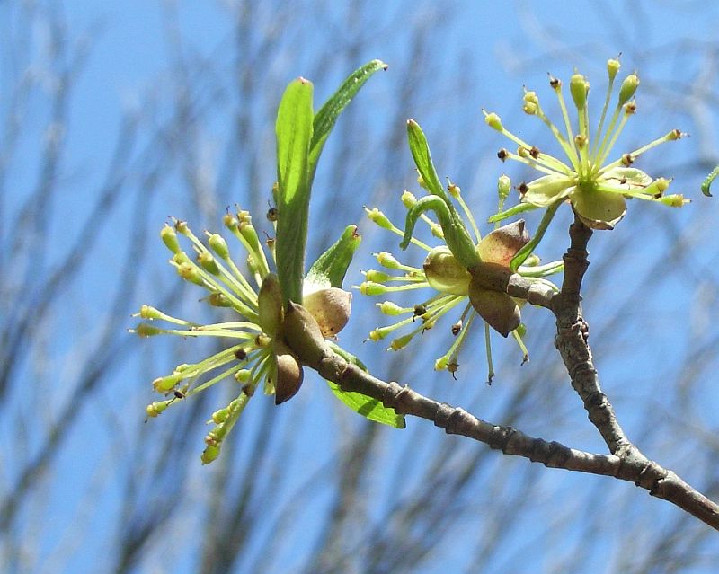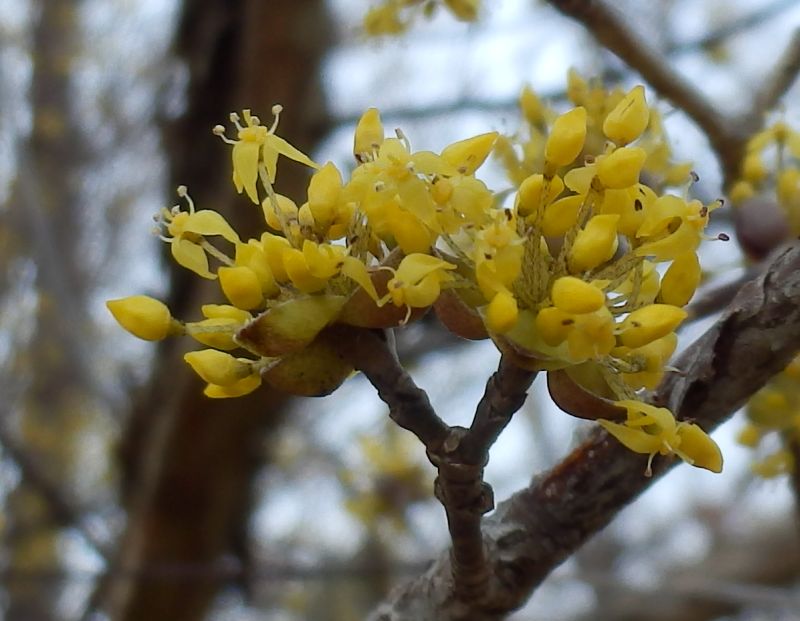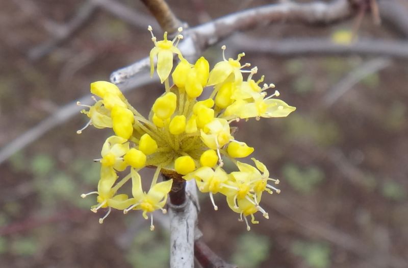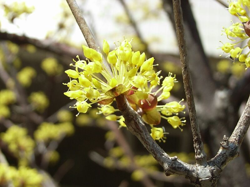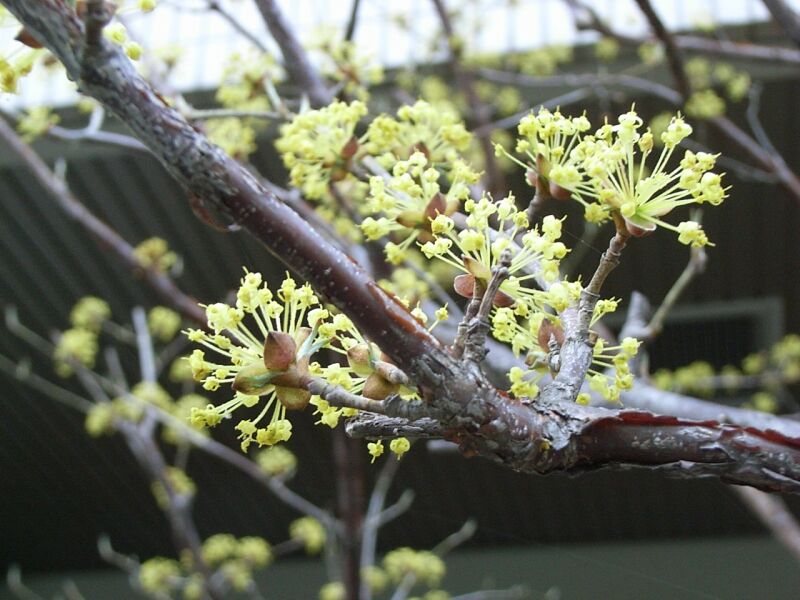 葉の出る前に短枝の先に半球形の散形花序を出して、