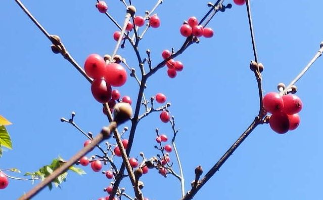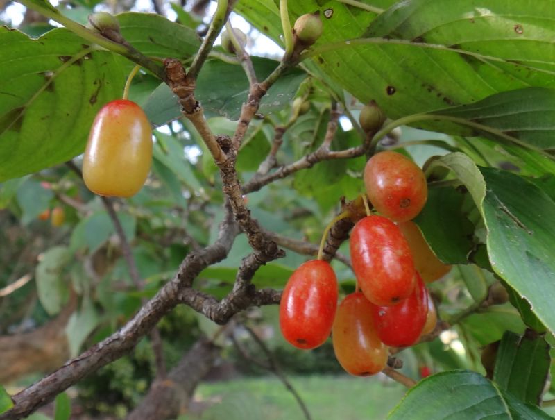 楕円体の核果をつけ、秋に赤く熟す。