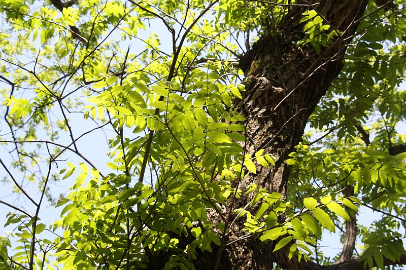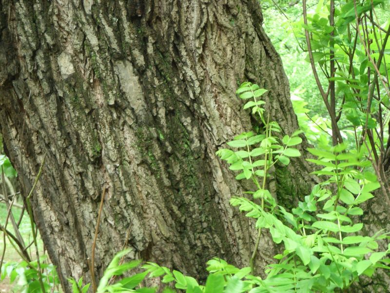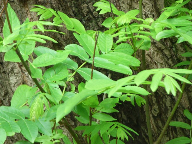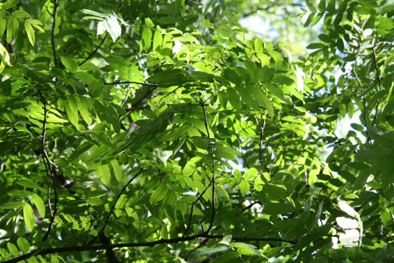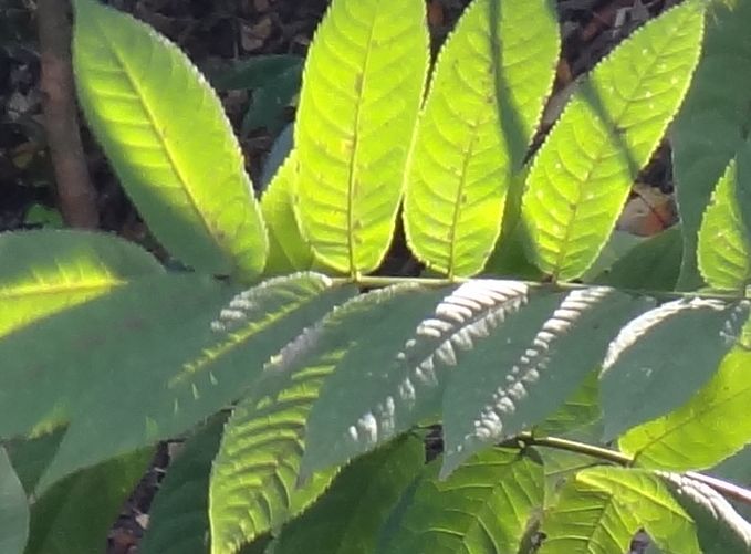 ヒッコリー :奇数羽状複葉、小葉長楕円形、雄花序下垂、雌花数個、核果状外種皮裂開。