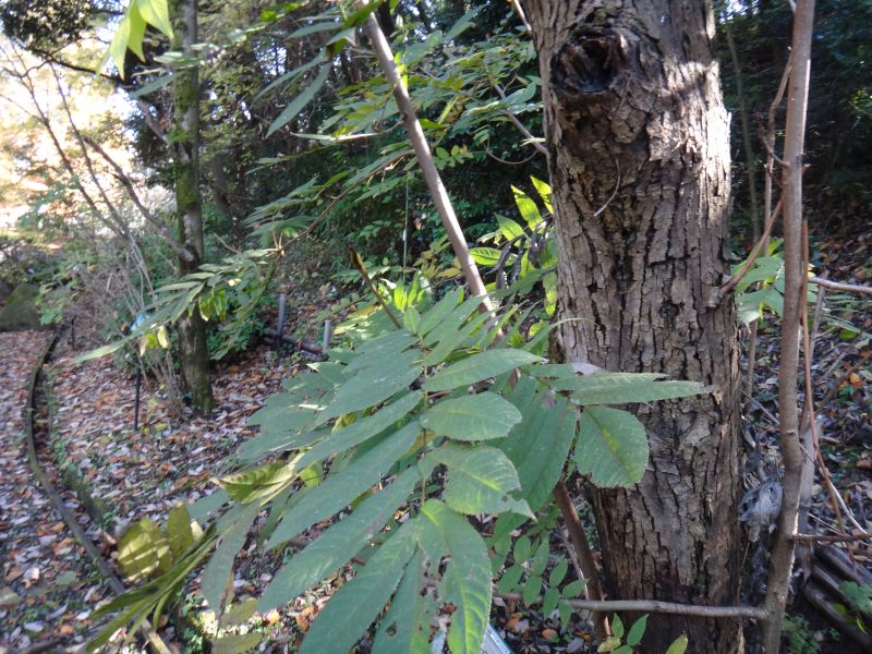 奇数羽状複葉の小葉は尖った楕円形で、鋭鋸歯がある。(2016/11/26)