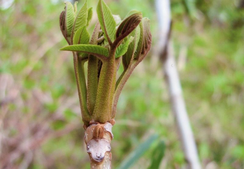 サワグルミの葉痕と芽吹き。若枝には褐色の毛がある。 Photo by H. O. (2008/4/25)