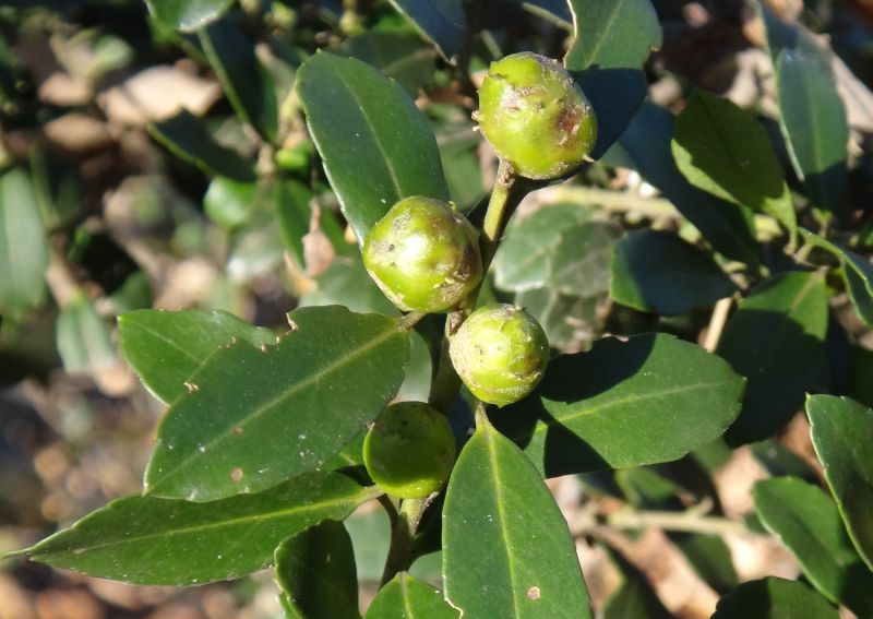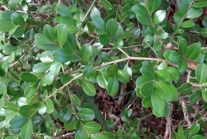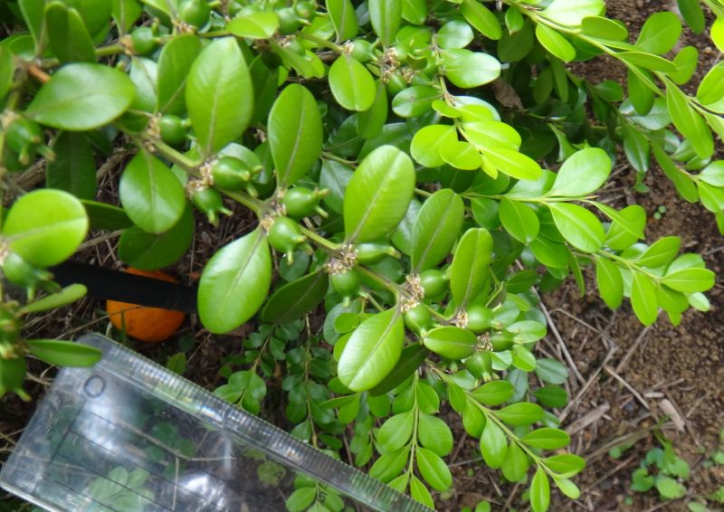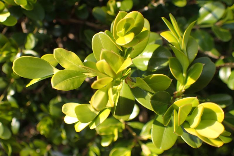セイヨウツゲ:低木、葉は2.5センチの倒卵形で全縁、先があまりへこまず、対生する。ツゲ科。