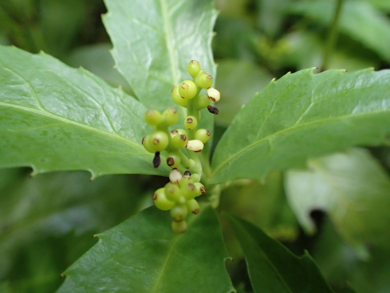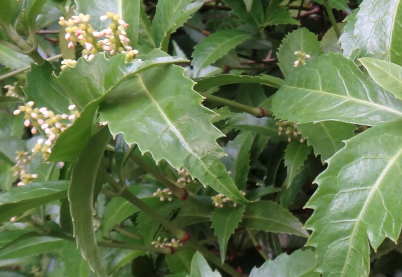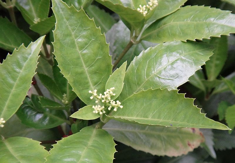 目立たない小さい薄緑色の花を小さな散房状につける。
