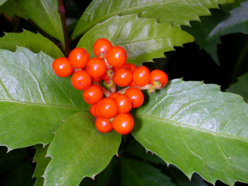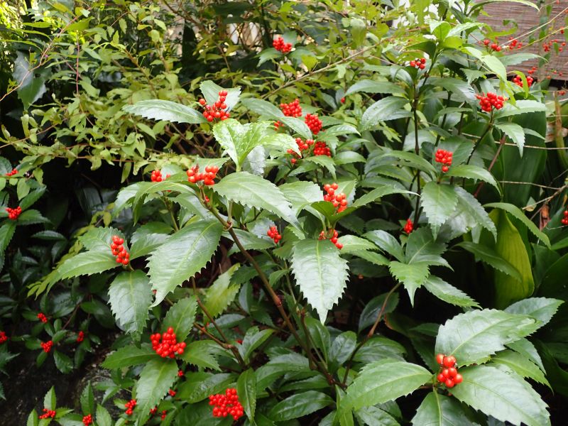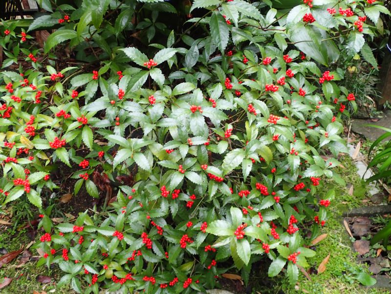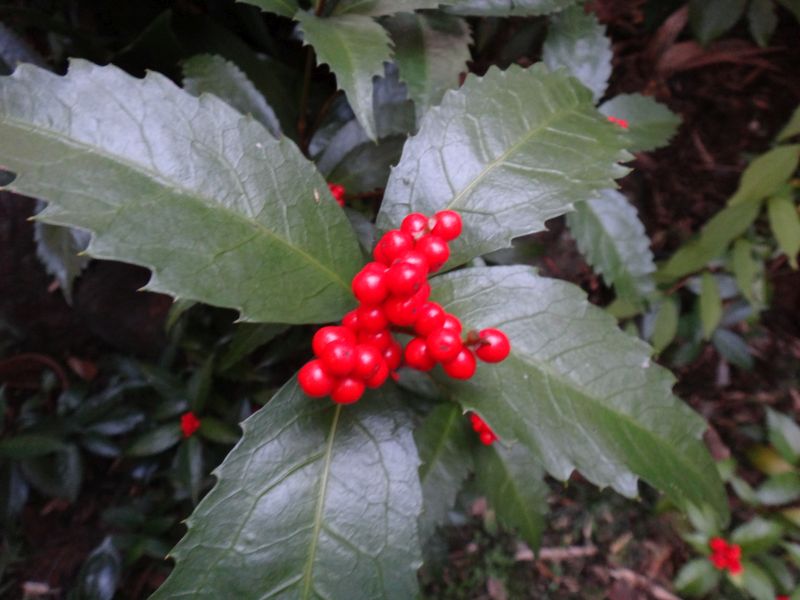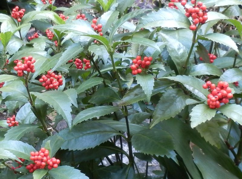 直径5ミリぐらいの球状の核果が枝先にむらがってつき、晩秋に赤くなって
