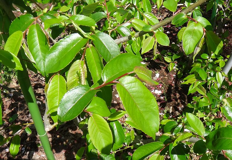 葉先の尖りの短い葉もある。新枝は赤みを帯びる。