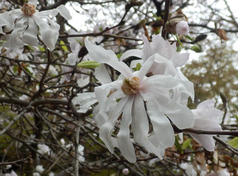 シデコブシ :花弁は12〜18枚で平開。色は白か淡紅色、葉は倒披針形。