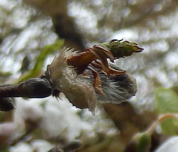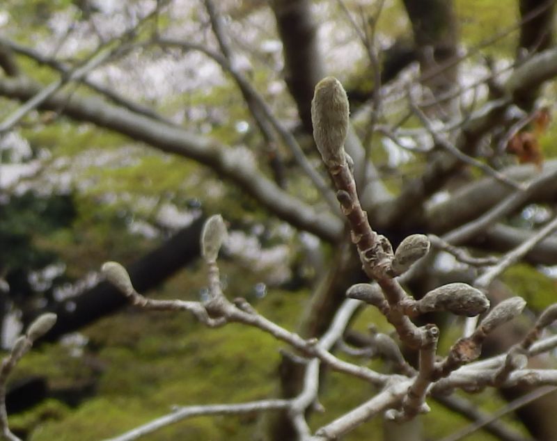 枝先のは長枝の花芽、その下部にあるのは短枝の花芽で、いずれも軟毛に覆われている。葉痕が大きい。