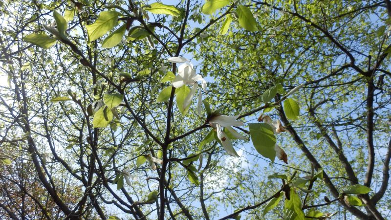 ハクモクレン:花弁は6枚で上向きに半開。色は白、葉は倒卵形。
