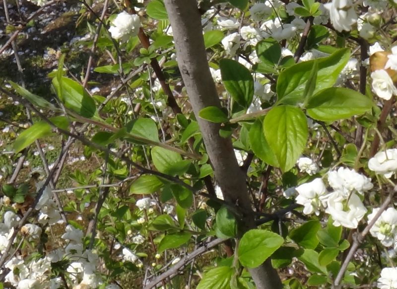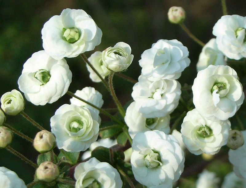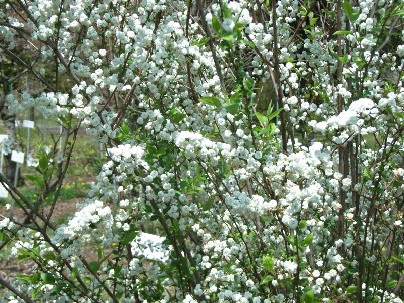 新葉とともに白い八重咲きの花が前年枝の散房花序に3〜10個ずつかたまって咲く。