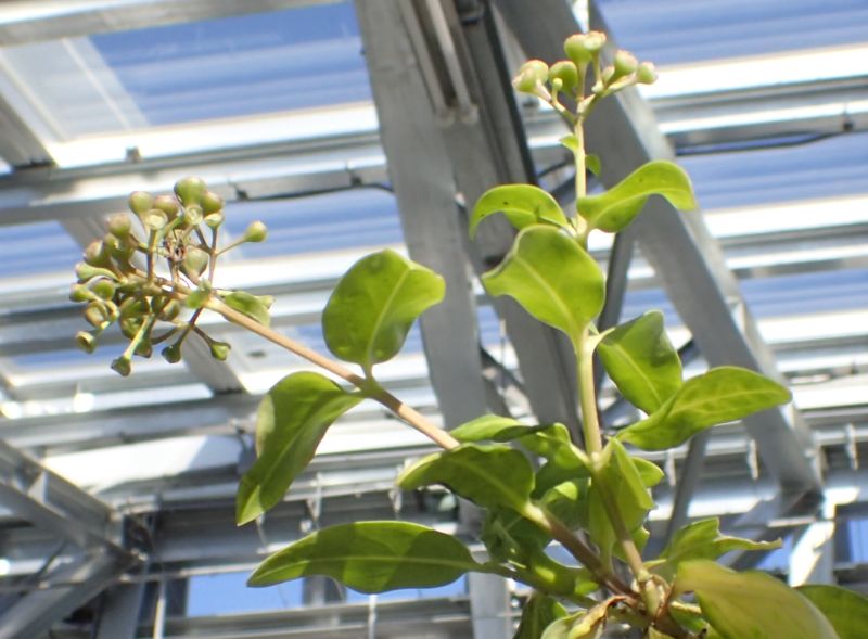 枝先の集散花序に、かすかに淡紫色を帯びた白い花を咲かせる。