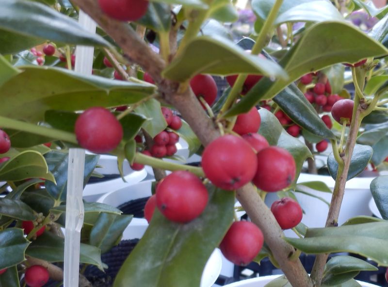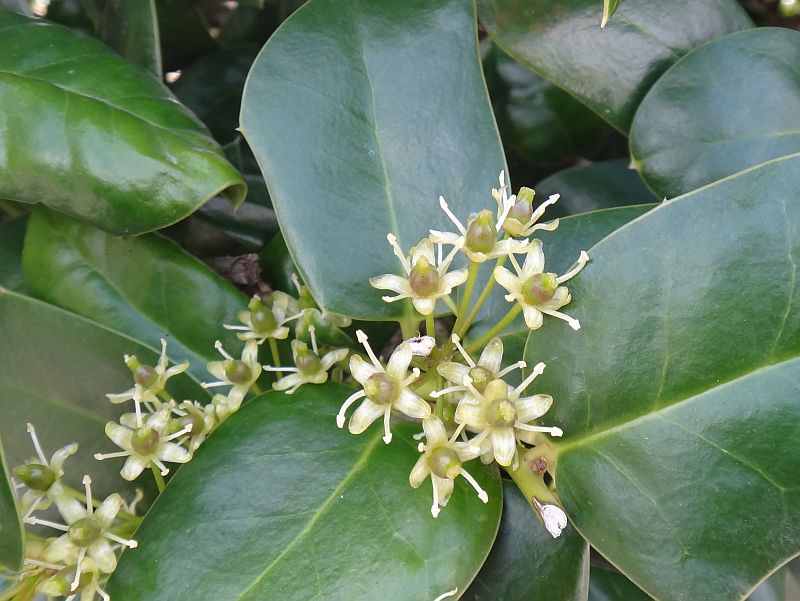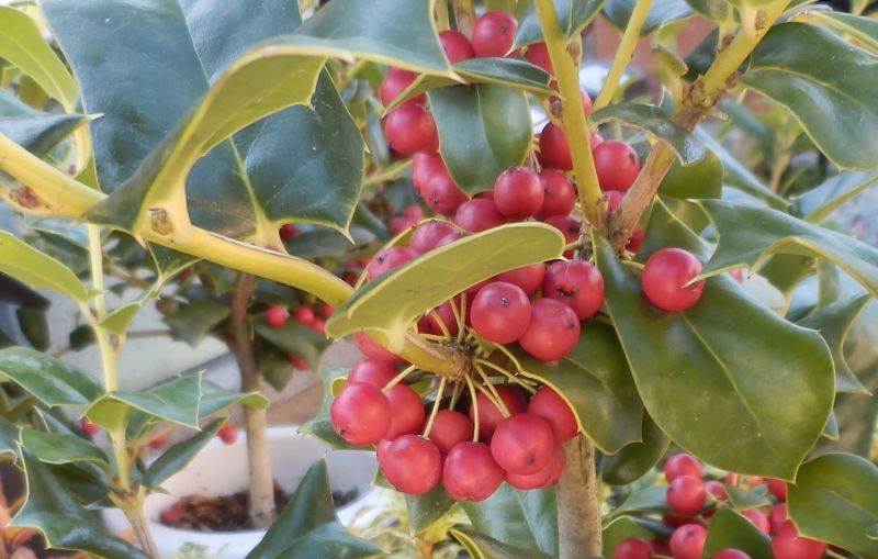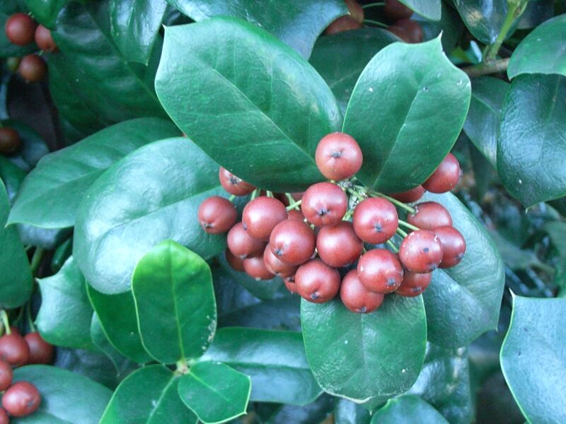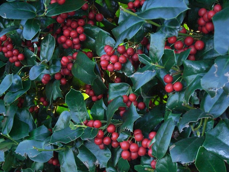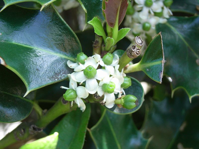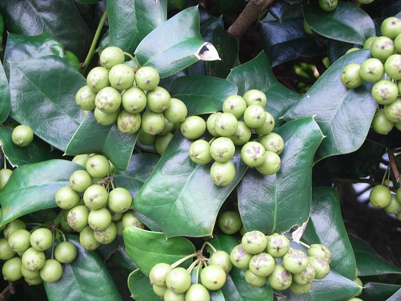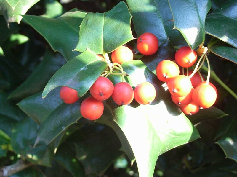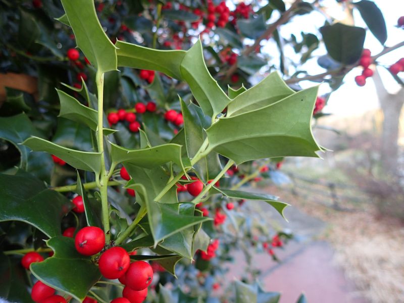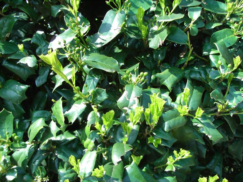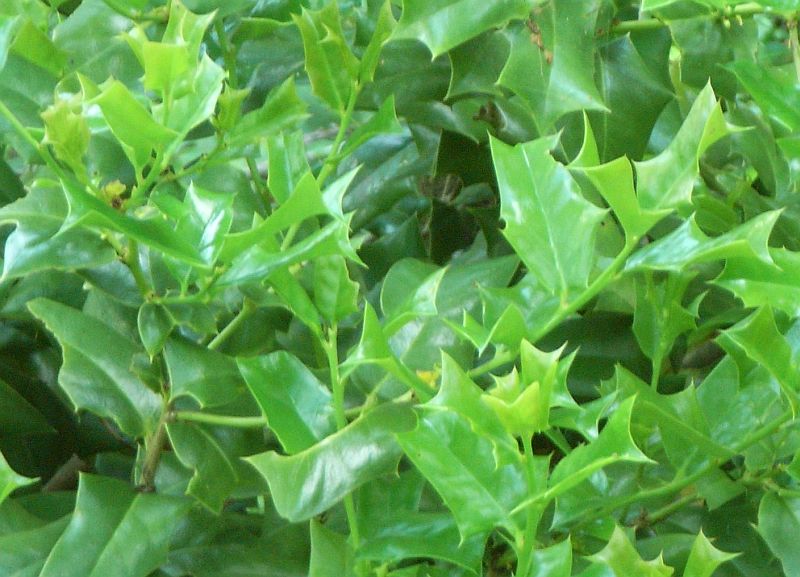 セイヨウヒイラギ:葉は楕円状で光沢あり、葉厚く棘痛い。