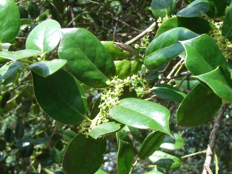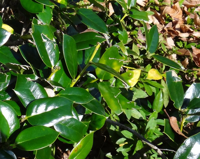 アメリカヒイラギ:葉は楕円状で光沢弱く、葉やや薄く棘痛くない。