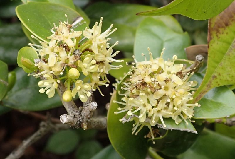 春に前年枝の葉腋に黄緑色の小さい花を束生させる。