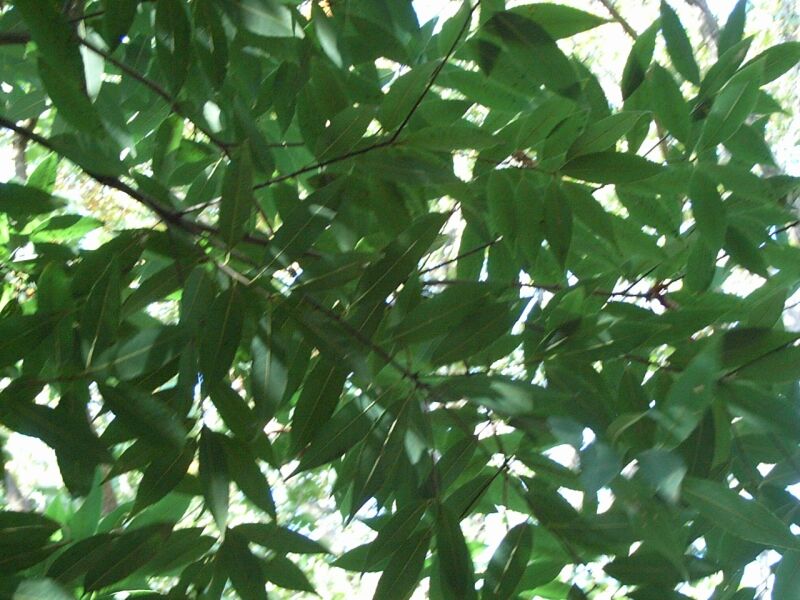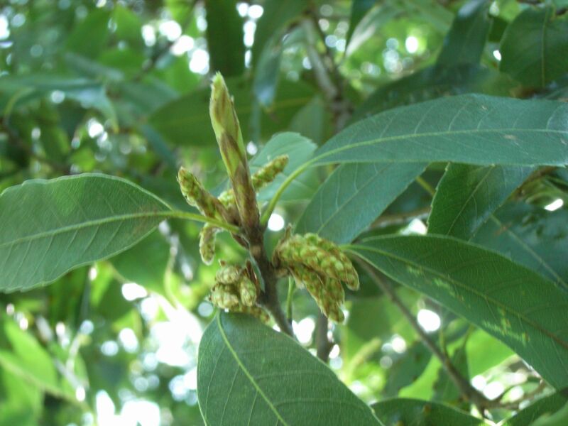 シラカシ:樹皮は黒くて葉が柔らかく、雄花は前年枝につき、雌花は新枝につき穂になる。