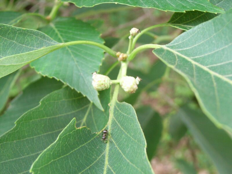 新枝の上部の葉腋には短い雌花序が直立し、