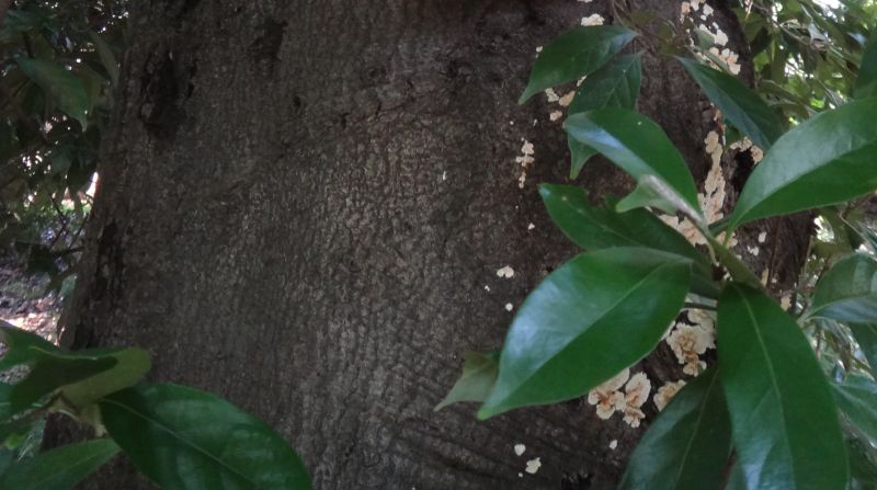幹は灰黒色で細かいひび割れがあるが、おおむね平滑。