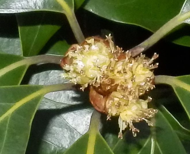 雄花。総苞片は丸くて、花被片は4枚、雄しべは6本ある。