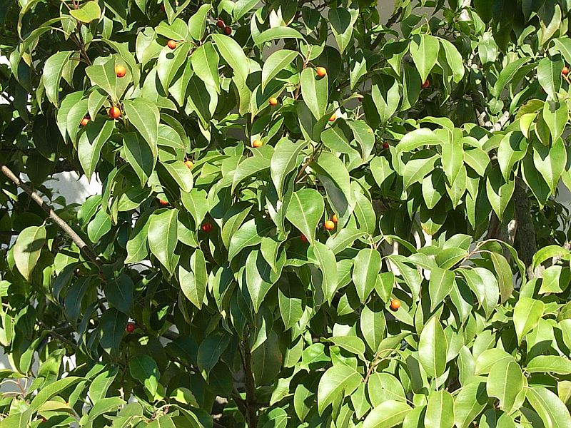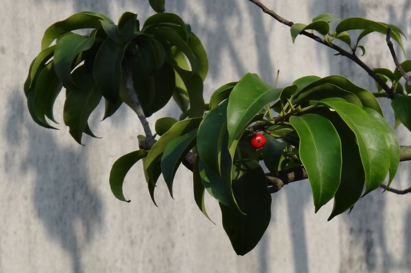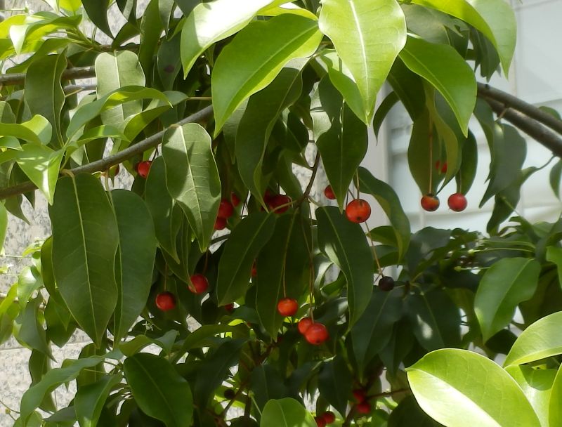 直径約8ミリの丸い核果がぶら下がり、秋に赤く熟す。