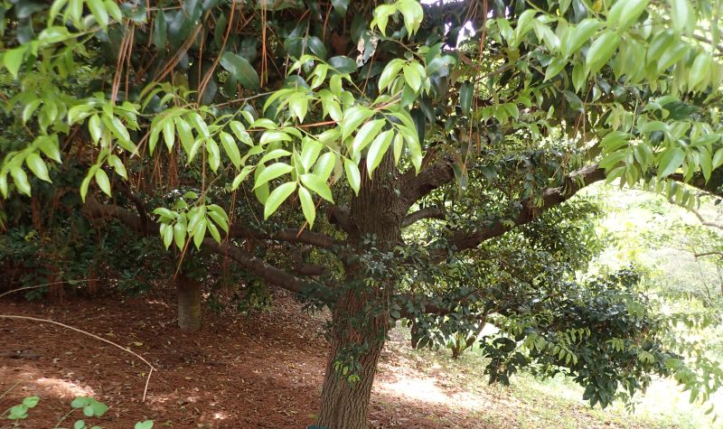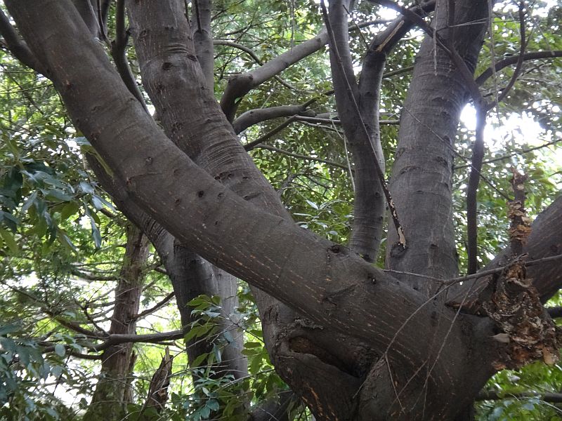 幹は直立後よく分枝し、樹皮は黒褐色で、成長すると縦の裂け目が入る。
