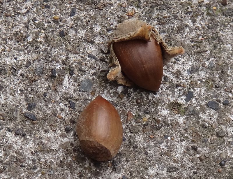 果実は卵状長楕円形で灰褐色の殻斗に包まれており、翌年の秋に熟す。