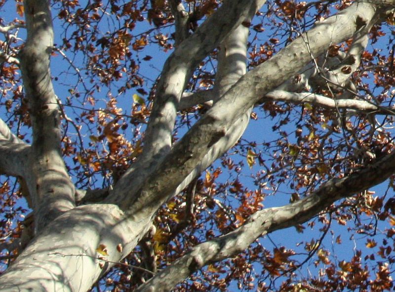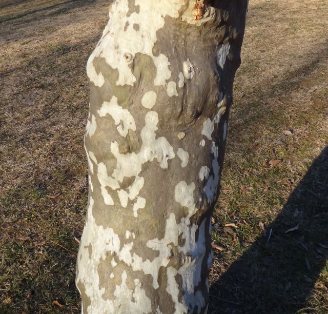 樹皮は、大きく薄片状にはがれて、灰白色と緑褐色のまだら模様になる。