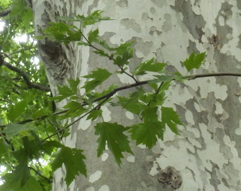 スズカケノキ :葉は深く切れこみ、樹皮に緑褐色のまだら模様、