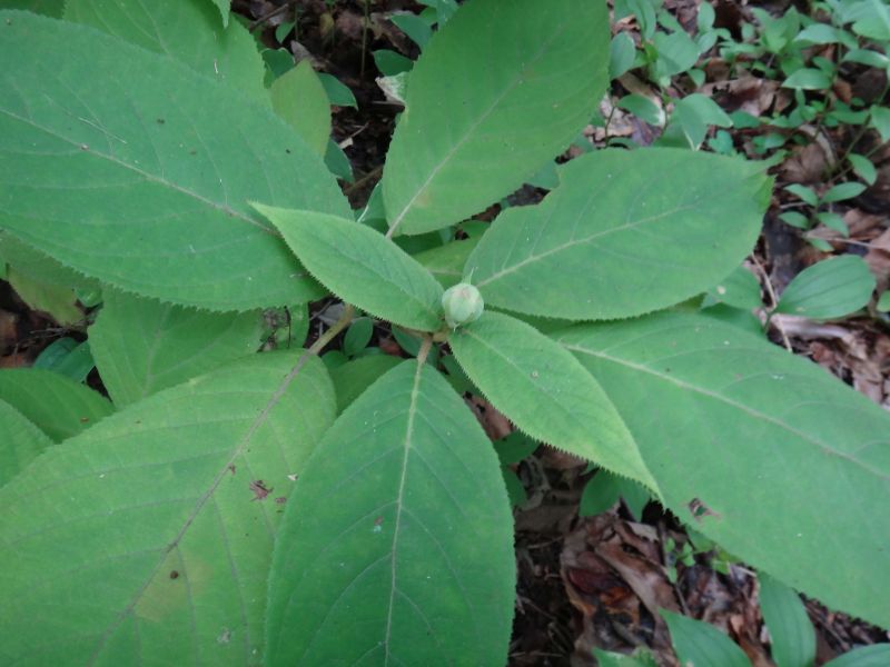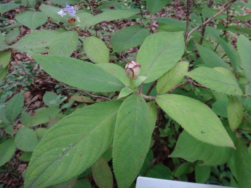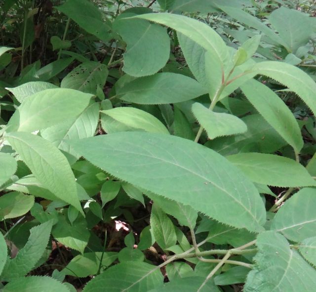葉は尖った長楕円形で、細かい鋸歯が並ぶ。(2016/7/28)