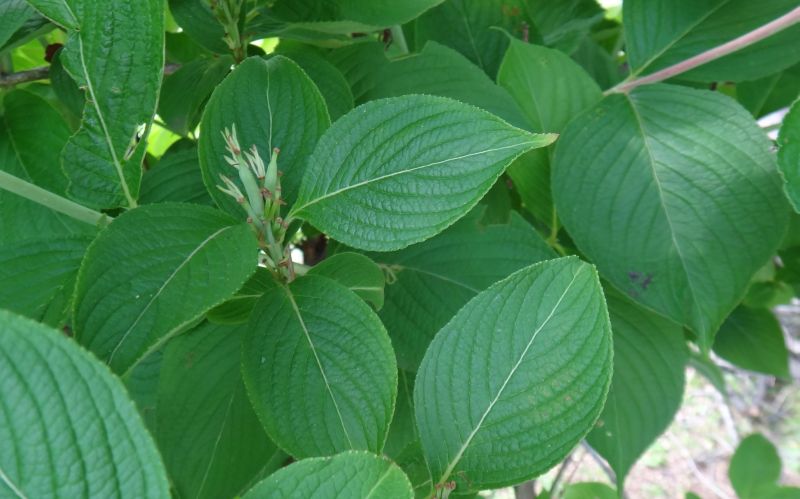 葉は先が鋭くとがった長さ4〜10センチの卵状楕円形で、鋸歯があり、