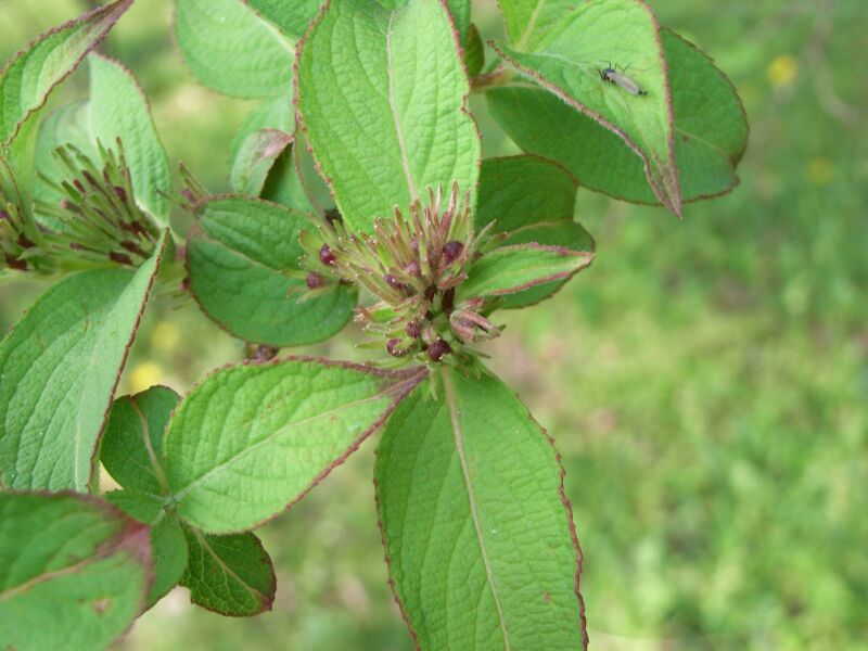 初夏に枝先や上部の葉腋の散房花序に紅色の花をつける。