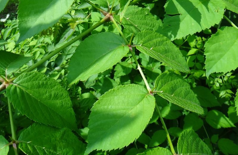 不揃いな鋸歯があり、表面にも葉柄にも棘がある。
