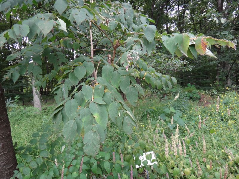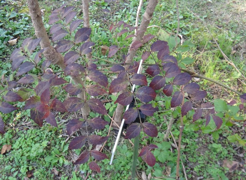 秋に葉が赤くなり、下の複葉は葉柄ごと落ちる。