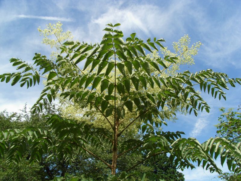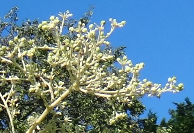 初秋に幹の先端から長さ30〜50センチの大きな散形花序を出し、