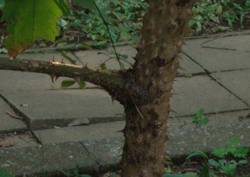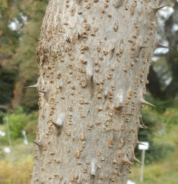 樹皮は灰褐色で丸い皮目があり、幹にも枝にも長短の棘が多数ある。