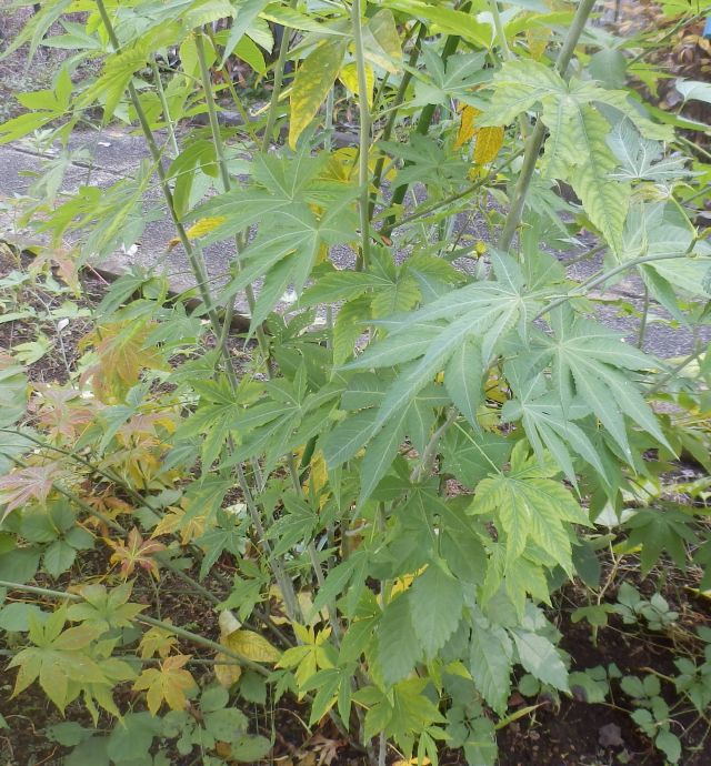 モミジのように、葉が掌状に5〜7裂し、裂片に鋸歯がある。