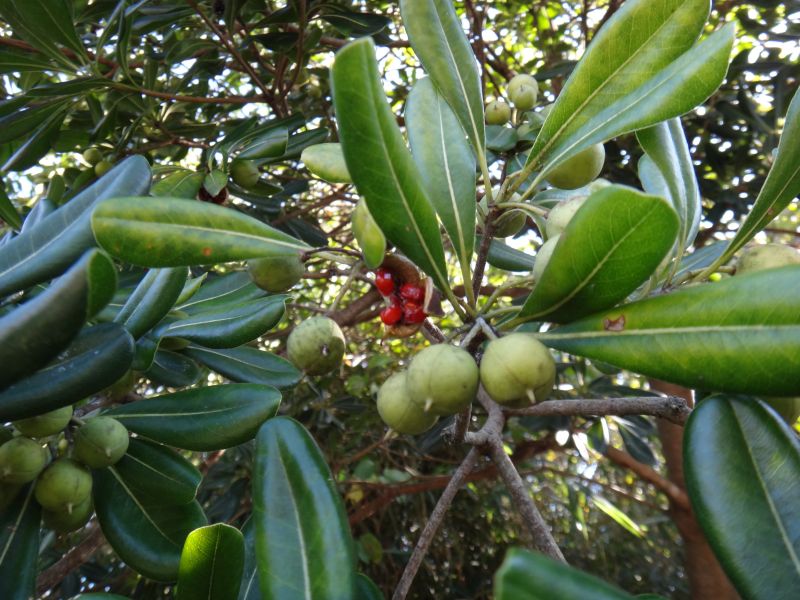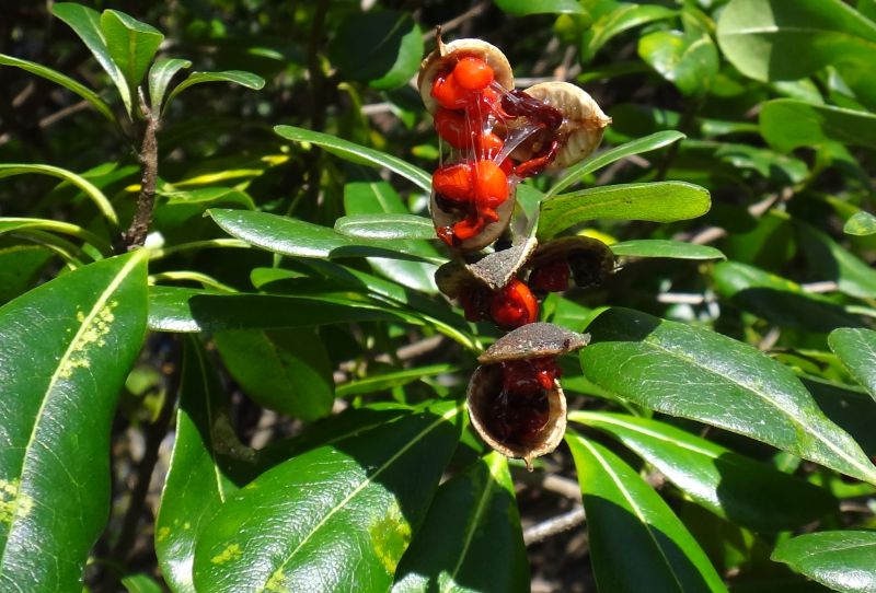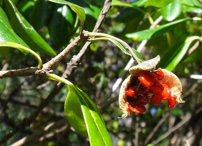 11〜12月に熟すと3裂して赤い粘液に包まれた種子が8〜12個現れる。