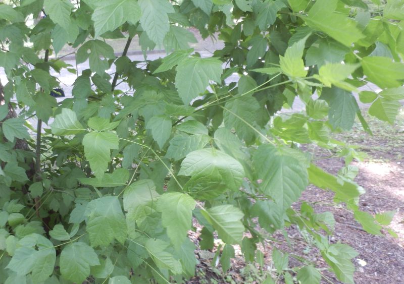 奇数羽状複葉の葉柄は長く、小葉の上半部に大きな鋸歯がある。(2015/5/10)