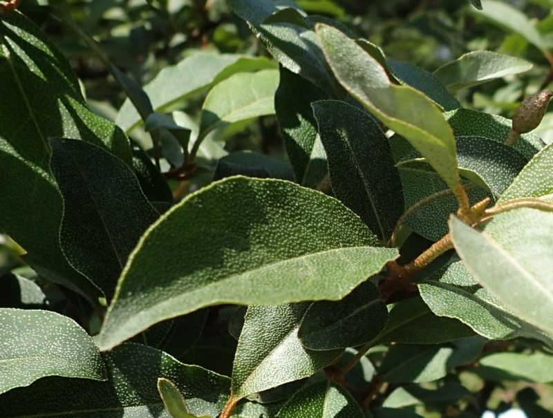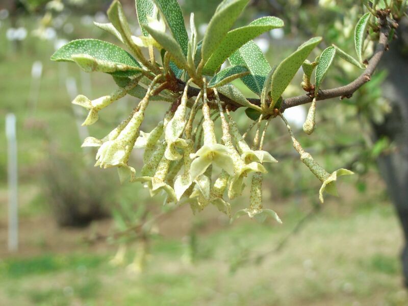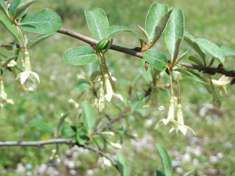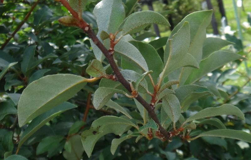 ナツグミ :春に咲き、楕円形の果実が初夏に実る。葉裏に銀白色と褐色の鱗片が混生する。